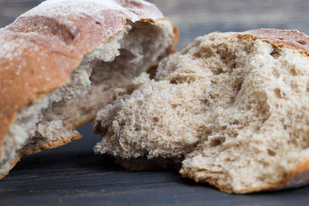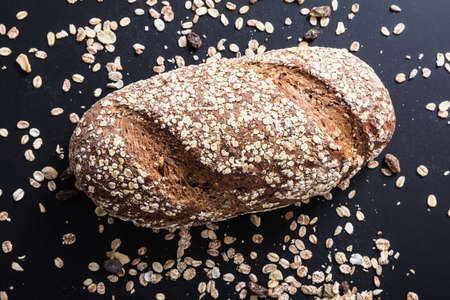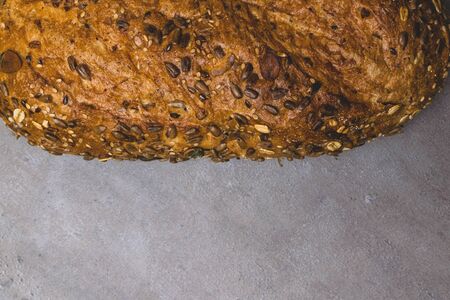 Delicious fresh crispy brown bread with grains and seeds on a dark concrete background