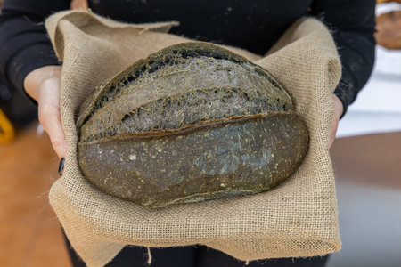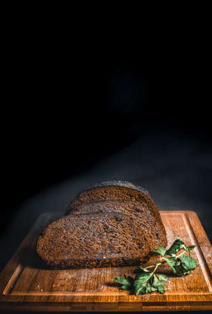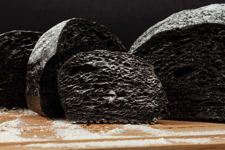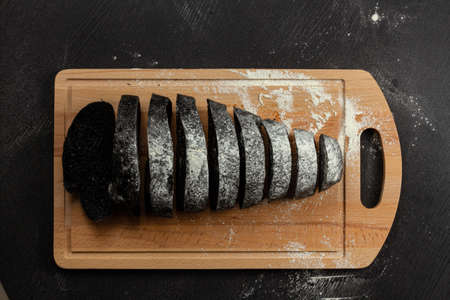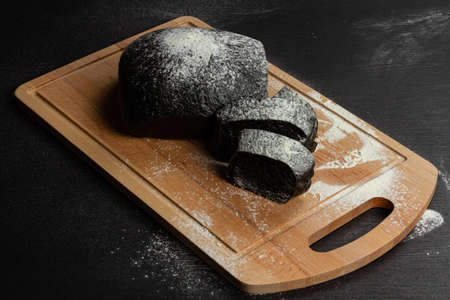 fresh fragrant black rye bread on a cutting board with flour on a black wooden table