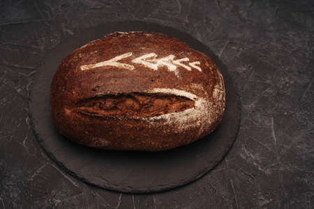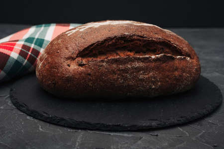 Rye bread on black background with copy space. Round Loaf of fresh baked dark bread on cutting board close up