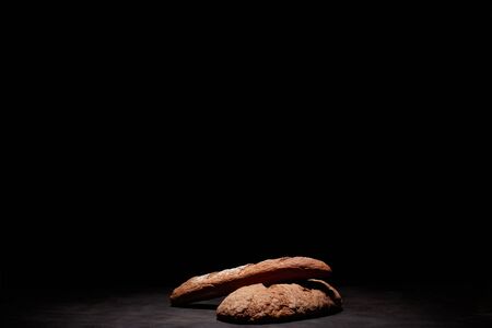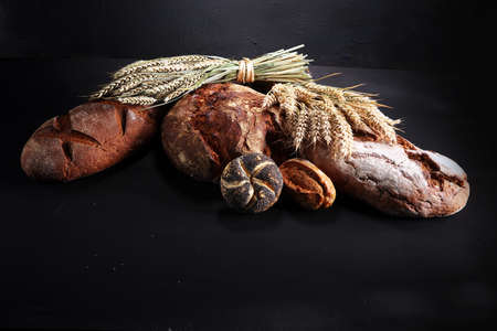 Fresh fragrant bread on the table. Food concept Wheat pastry on black background