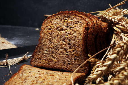 Fragrant black bread with spices, grains and ears of wheat on a wooden vintage surface