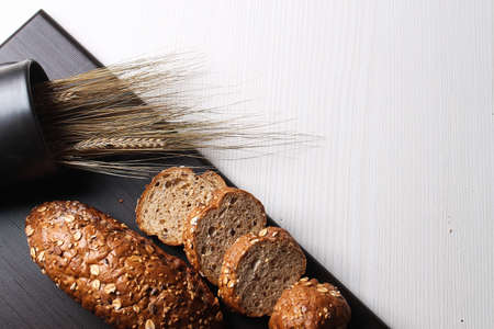 Fresh baked bread with ears of wheat. Wheat yellow. Breakfast is