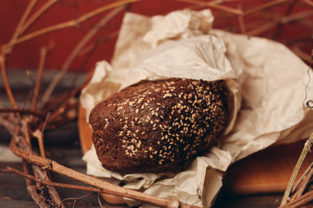 Loaf of Bread In a paper package lies on branches in a nest on a wooden table