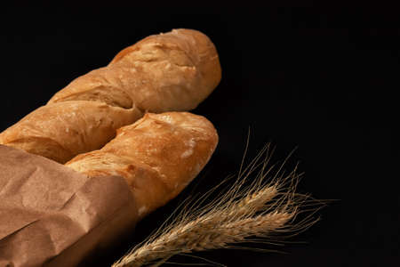 French baguettes in a paper bag and ears of wheat on a dark table top. view from above