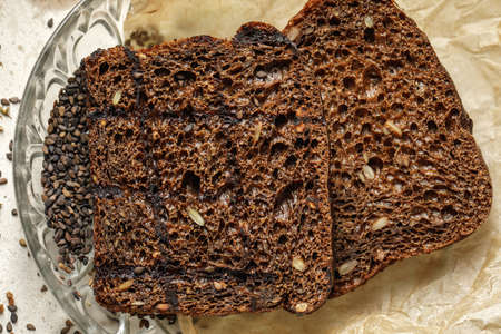 Organic wholegrain rye healthy bread with seeds in glass plate on baking paper. Healthy lifestyle concept