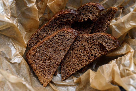 broken into pieces dark bread with a crisp crust on a wooden table, a loaf of delicious homemade bread with soft and fragrant flesh