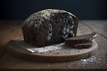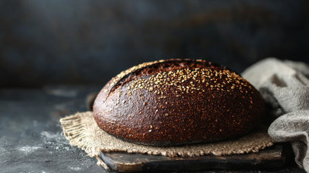 Homemade bread loaf with seeds on dark backdrop. Perfect rustic bakery and food photography concept.