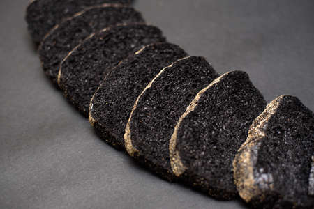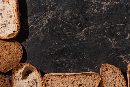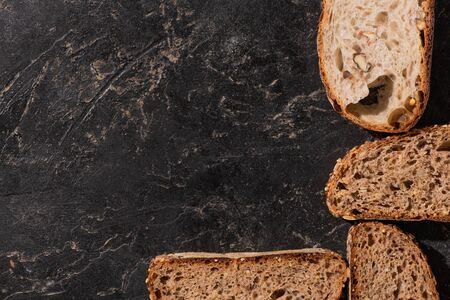 Wholegrain sliced freshly baked bread with flax and sesame seeds on black background. Top view.