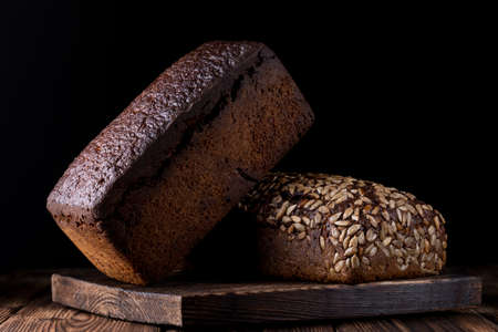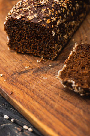 delicious fresh baked brown bread with bran sunflower seeds on a dark background, horizontal image