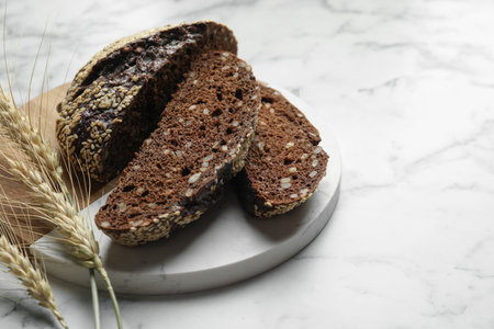 Pieces of fresh rye bread with seeds and spikes on white marble table, closeup. Space for text