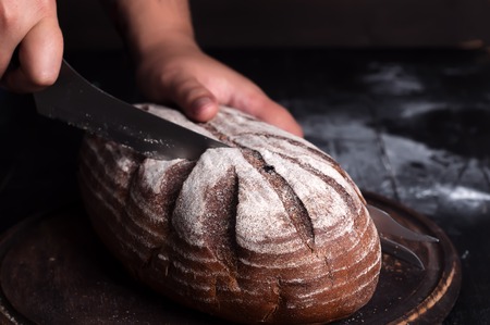Close-up of woman hands cutting fresh bread from oven. Dark photo