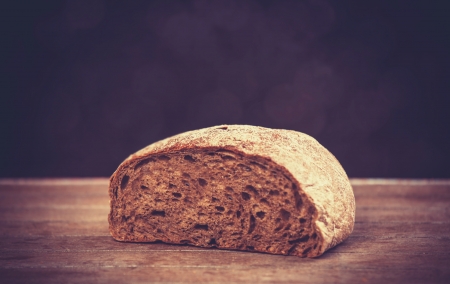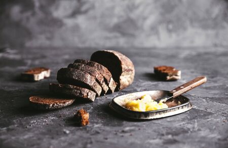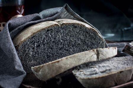 Artisan crusty dark rye bread on gray linen napkin. Copy space. Low key