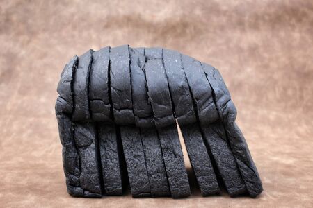 Multi grain board close up - Image. Black bread sliced ​​​​on the background of the decor of flowers - Image