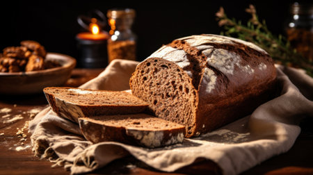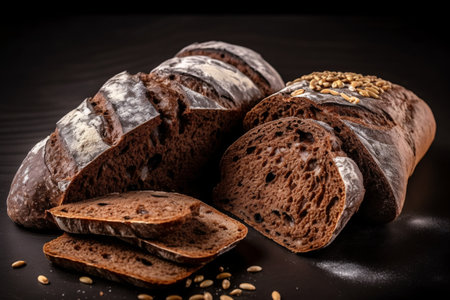 Sliced rye bread on a wooden board with flour on a black background. Bakery concept. Generative AI technology.