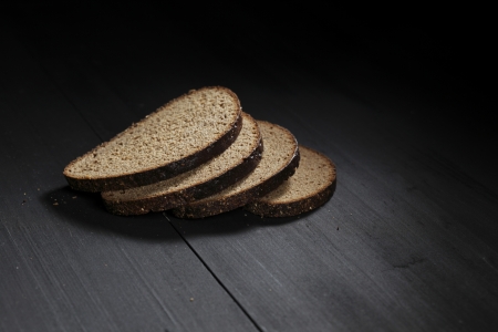 Wholegrain sliced freshly baked bread with flax and sesame seeds on black background. Side view.