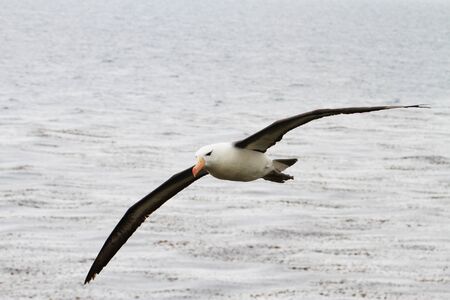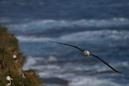 Close up of a Black-browed Albatrosses in flight over a rookery on the coasts of the Falkland Islands.