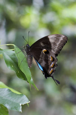 Close-up of big blue and black pipevine swallowtail butterfly resting on green foliage with abstract, soft focus background. Copy space.