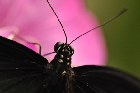 Macro photography of butterfly. Big black eyes. Copy space, selective focus.