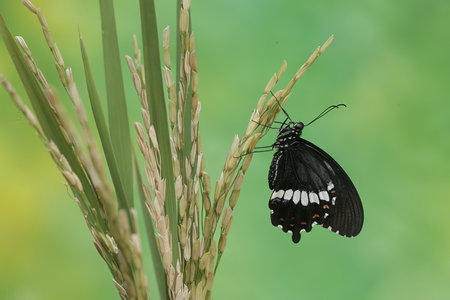 Butterfly on rice in rice field. (Papilio machaon)