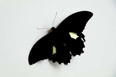 Black colored butterfly with a cream spot on its wings against white background, high angle shot