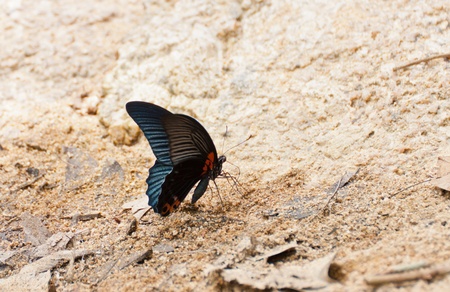 blue-black Morpho butterfly gathering water on floor in Thailand