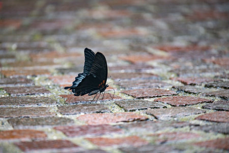 Butterfly on the cobblestone in the city park.