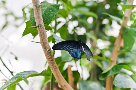 black tropical butterfly sitting on the leaf