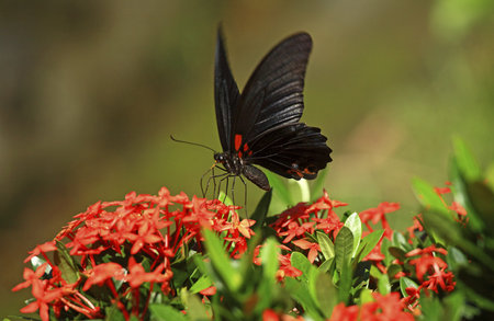 Close up of mail great mormon butterfly perching on red ixora flower, back side
