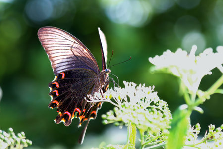 A stunning Chinese Peacock Butterfly (Papilio bianor) perched gracefully on delicate white blossoms. Its iridescent blue-black wings and vibrant red markings create a captivating. Taiwan.