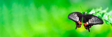 Chic Butterfly Papilio rumanzovia sits on colours. Natural green background with copy space.