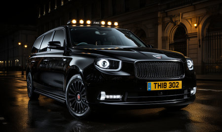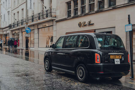 London, UK - October 02, 2021: Modern black cab parked outside Loro Piana store on Bond Street, one of the most famous streets for luxury shopping in London, selective focus.