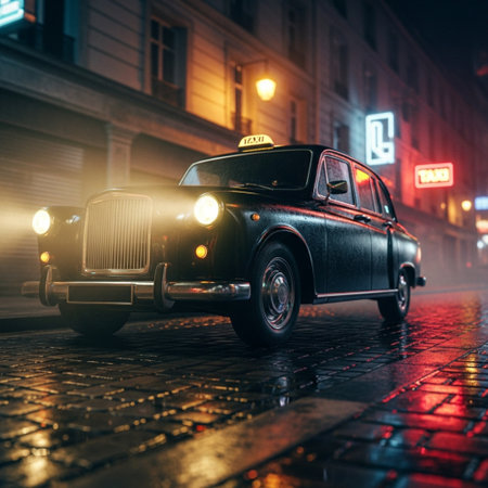 A monochrome AI-generated illustration of a black vintage car parked on the road
