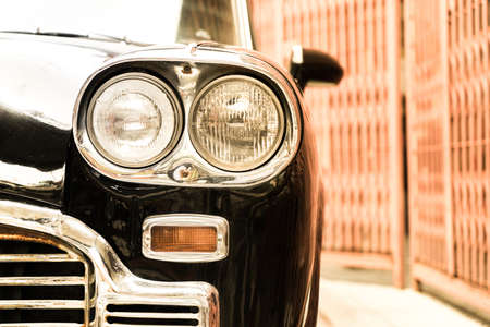 Headlight of the old beautiful car on the background of a concrete wall.Side view. Copy space. Concept banners repair, sale of cars. Close-up.