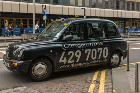 Glasgow, Scotland, UK - June 17, 2012: Street scene near Central Station and Argyle Street with cloeup of black taxi cab, parked.