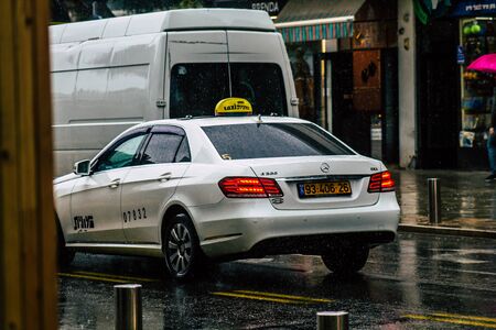 Tel Aviv Israel February 19, 2020 View of traditional Israeli taxi rolling in the streets of Tel Aviv during a raining day in winter