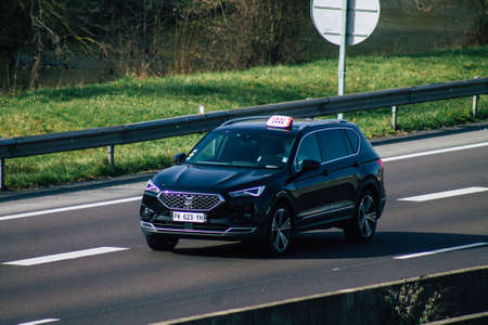 Reims France February 24, 2021 Taxi for passengers rolling in the streets of Reims during the coronavirus pandemic affecting France