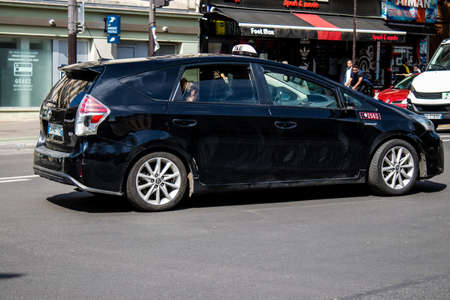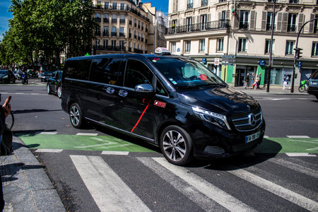 Paris, France - September 14, 2022 Taxi driving through the streets of Paris, This mode of transport is famous and widely used by Parisians and tourists, several companies compete in the city of Paris