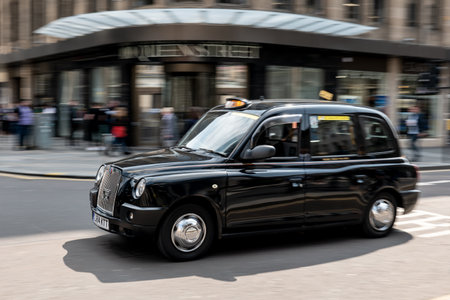 A picture of taxi or cab captured in motion or in panning technique in daylight in London, UK. Concept of hurry and speed