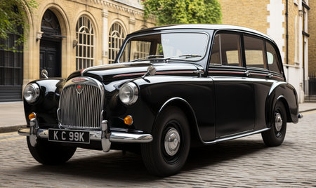 Black London Taxi Parked on a Quiet Street with Red Brick Building