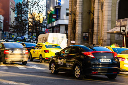 Uber car in traffic, modern city taxi service. Car pollution, traffic jam in the morning and evening in the capital city of Bucharest, Romania, 2020