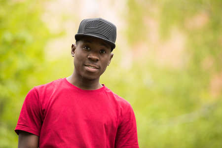 Confident african american man portrait, summer trees background