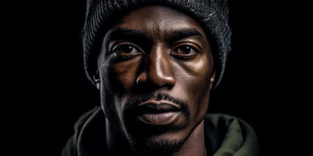 A young black man from Spain in street-style black clothing with a serious facial expression