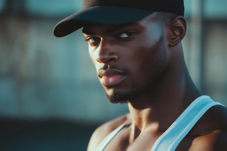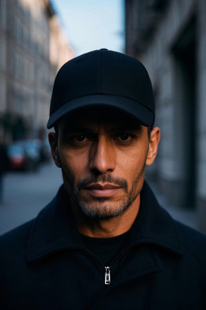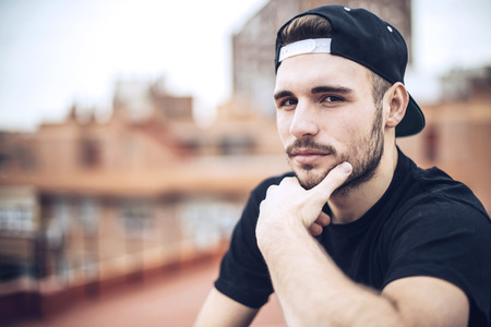 Brutal man rapper with cap posing in city
