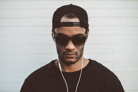 Music is in his veins. Handsome young African man in sunglasses and headphones standing in front of the stoned wall outdoors