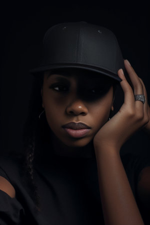 African american man holding a cap with his hand, fashion posing, pensive, fast-paced, against a black wall background