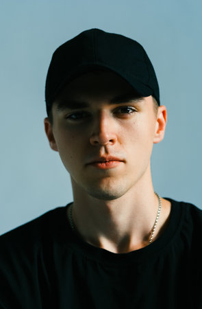 Portrait of stylish handsome caucasian man fashion model in t shirt and cap, studio shot.