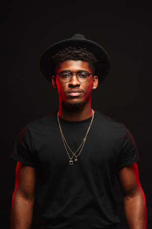 Portrait of handsome young african hipster guy in trendy hat and black t-shirt standing isolated over dark background on dark background