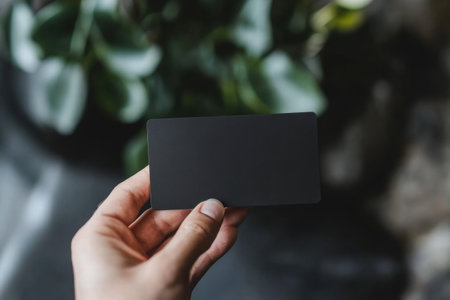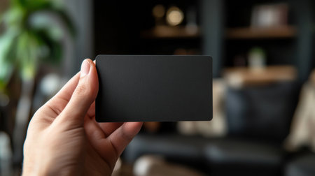 A hand presents a sleek black gift card against a soft background, allowing for text placement and mock up usage without distractions.