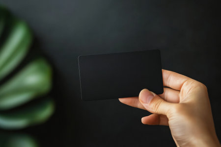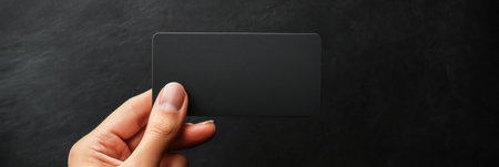 Hand holding blank black card with neutral background, minimalist design concept for business, identification, presentation, access.