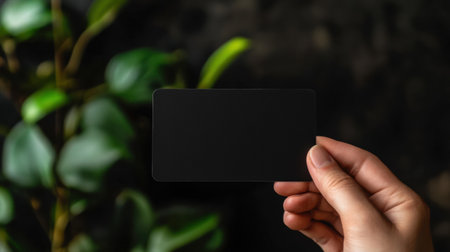 A person is holding a simple black gift card, surrounded by lush green leaves, offering space for custom text and branding opportunities.